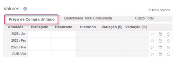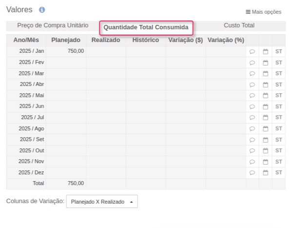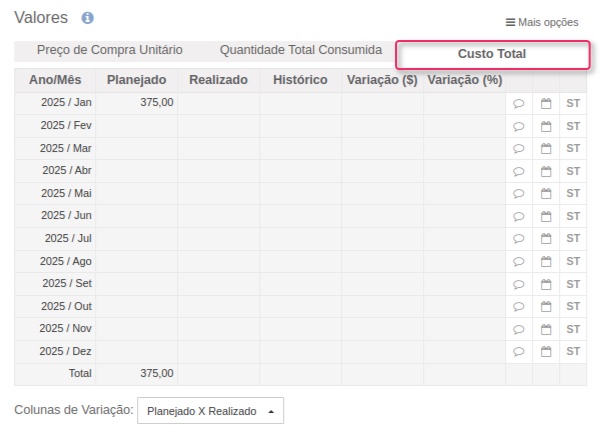 O Custo Total é o resultado da Quantidade Total Consumida x Preço de Compra Unitário, ou seja, os dois primeiros valores apresentados acima. Esse valor também não pode ser alterado, entretanto ao importar você pode importar o valor total ao invés do valor unitário.